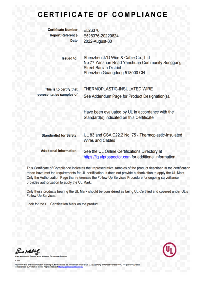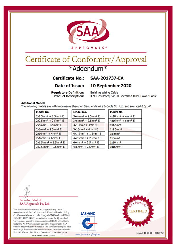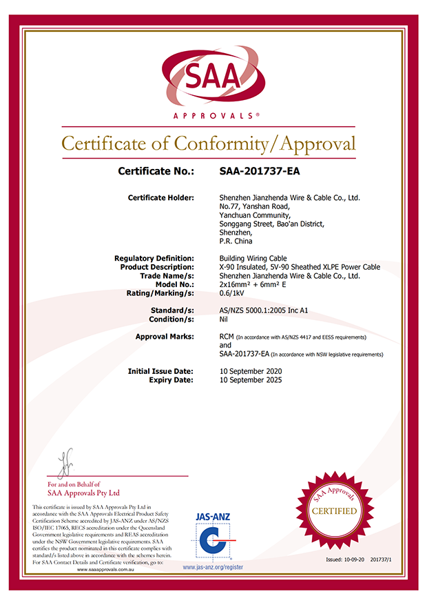 深圳建圳達電線電纜有限公司,成立于2000年,是一家電線電纜制造商,我們通過了世界各地不同市場的多數(shù)認證,如:CCC、RoHS、CB、SAA、TUV、VDE、PSE、BPS、UL、CSA。我們根據定制產品不斷更新新的認證。經過數(shù)十年的發(fā)展,我們與來自世界各地的客戶建立了長期的合作關系。我們曾經是菲律賓機場,,柬埔寨的電力站,美國的醫(yī)院,工廠,埃塞俄比亞的水電站項目。我們是一家值得信賴的電線供應商。